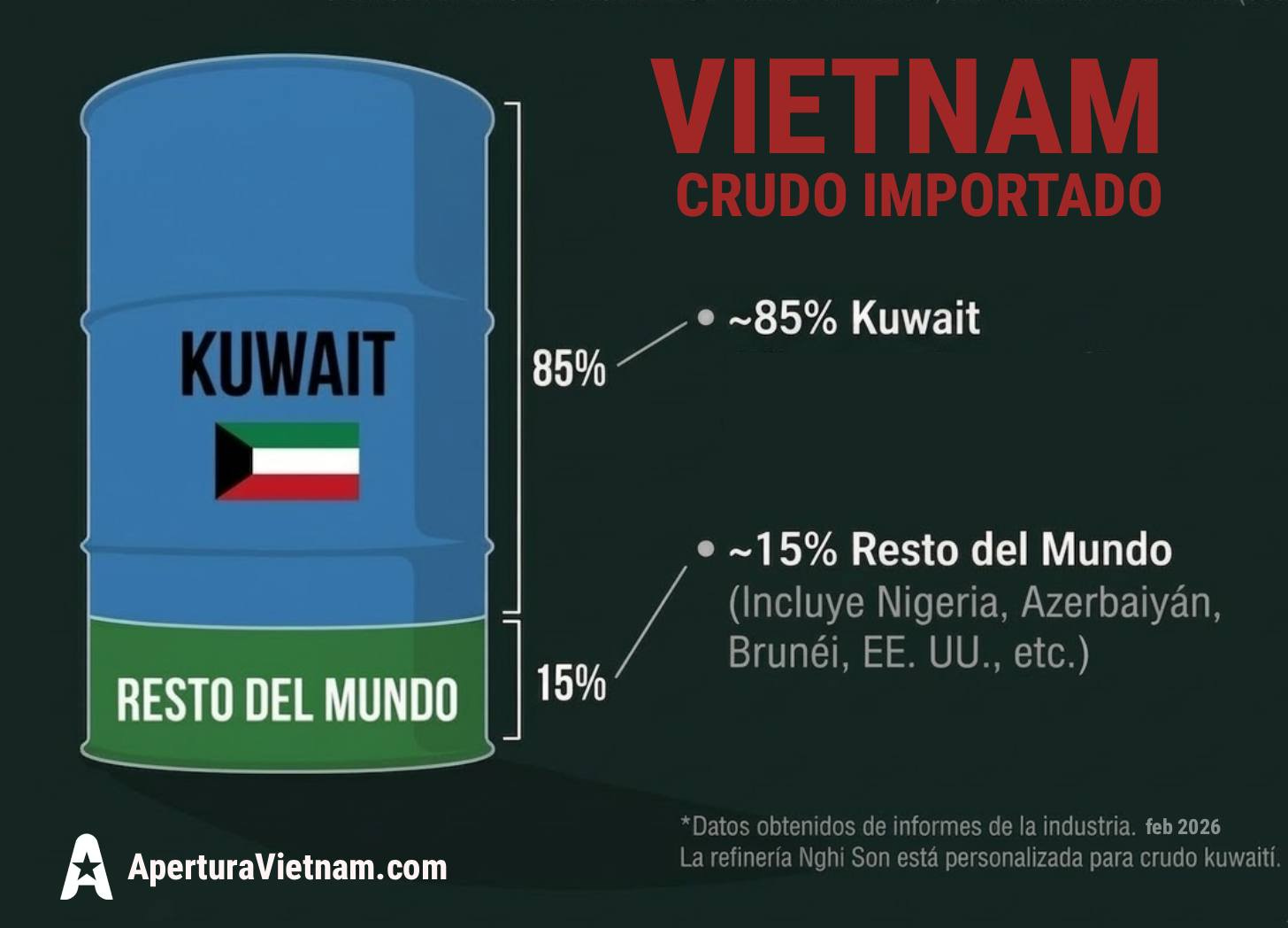 Entonces, ¿por qué narices dependemos de Ormuz? La respuesta es una mezcla de química y estrategia comercial. El petróleo de las costas de Vietnam es “Sweet Crude”: de altísima calidad, bajo en azufre y, por lo tanto, muy caro. En cambio, la refinería de Nghi Son, la más grande del país, se diseñó específicamente para procesar crudo “ácido” de Kuwait, que es más barato pero más difícil de refinar.